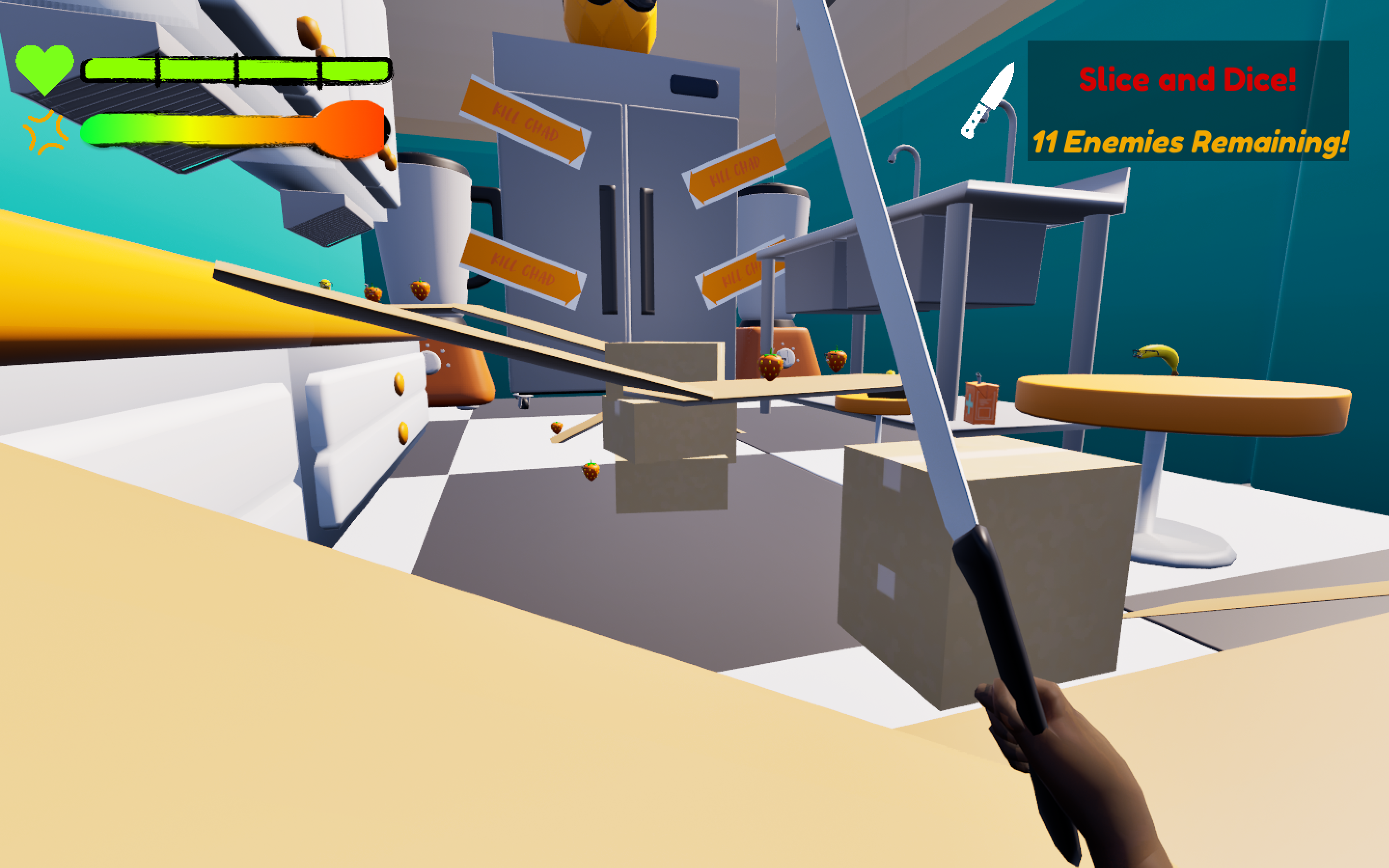 ...You suddenly awake in a much larger break room, with fruits that look suspiciously similar to Chad attacking you. Slice and dice, until nothing remains.